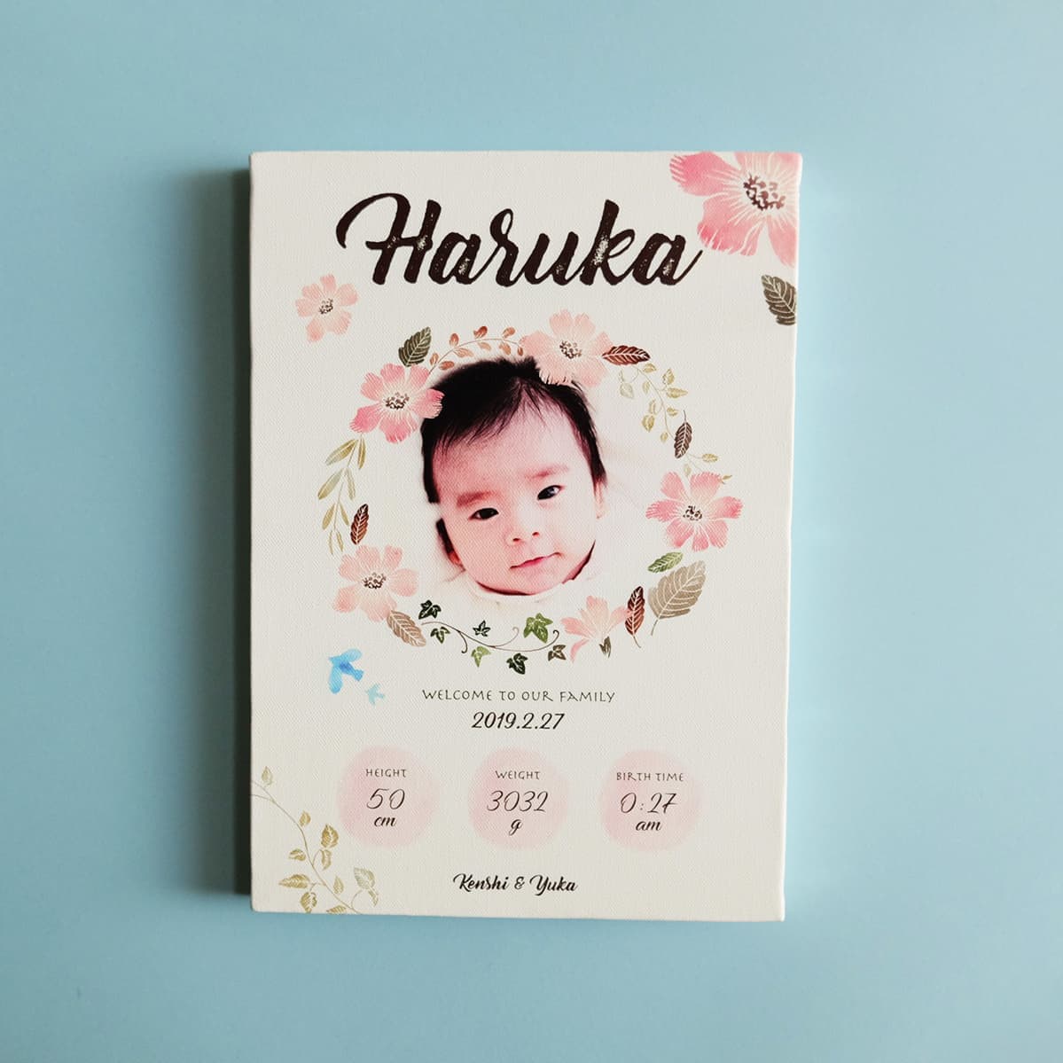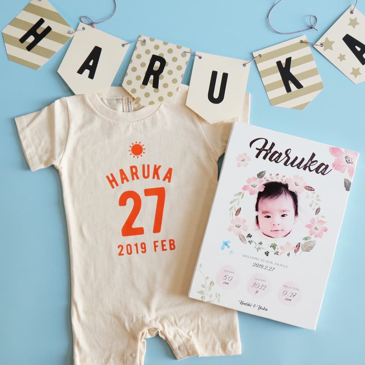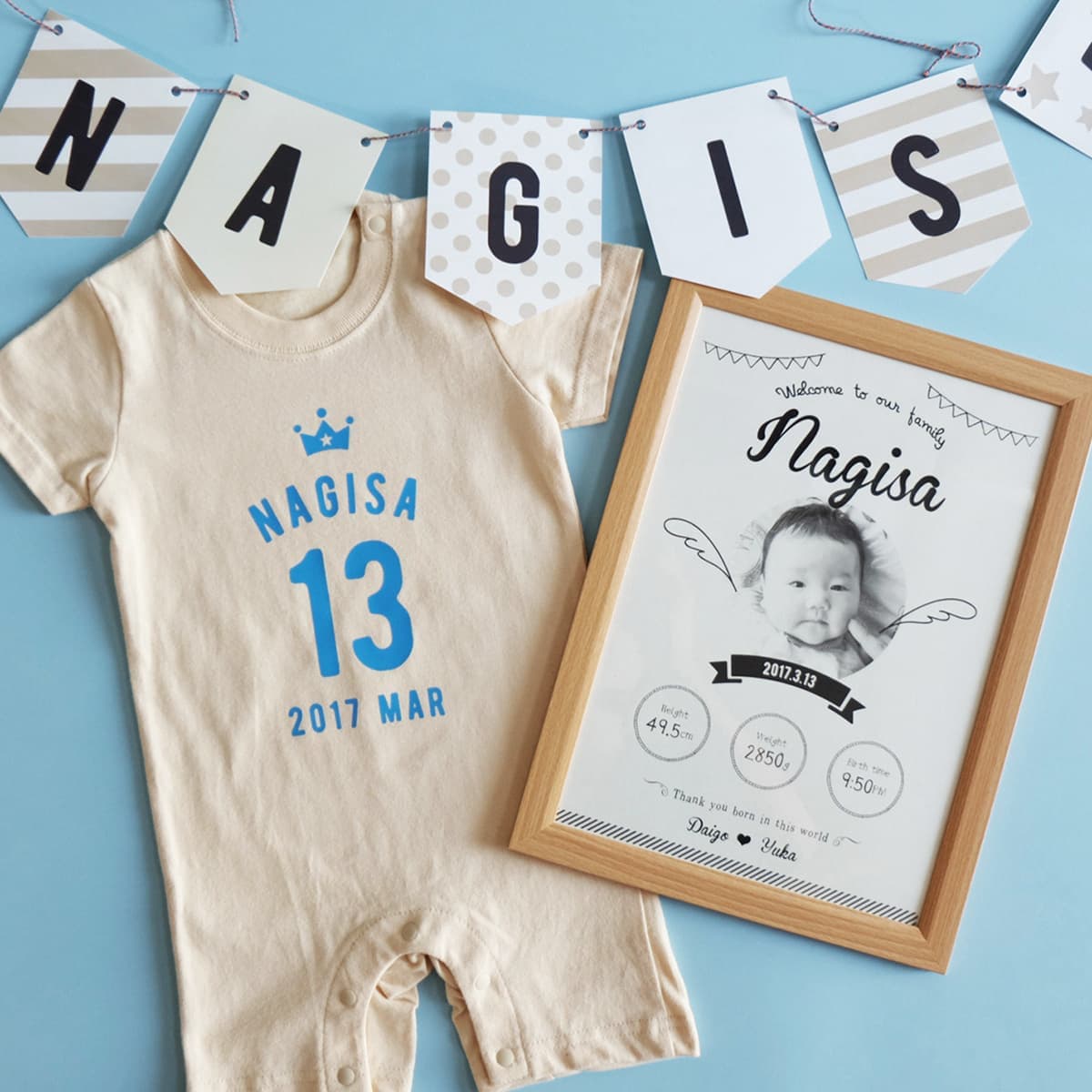 赤ちゃんの出生記録をデザインしたベビーポスター、お名前をプリントしたロンパース、お部屋に飾るガーランド。全て手作りで丁寧に名入れさせていただきますので、オリジナルのギフト商品が出来上がります。