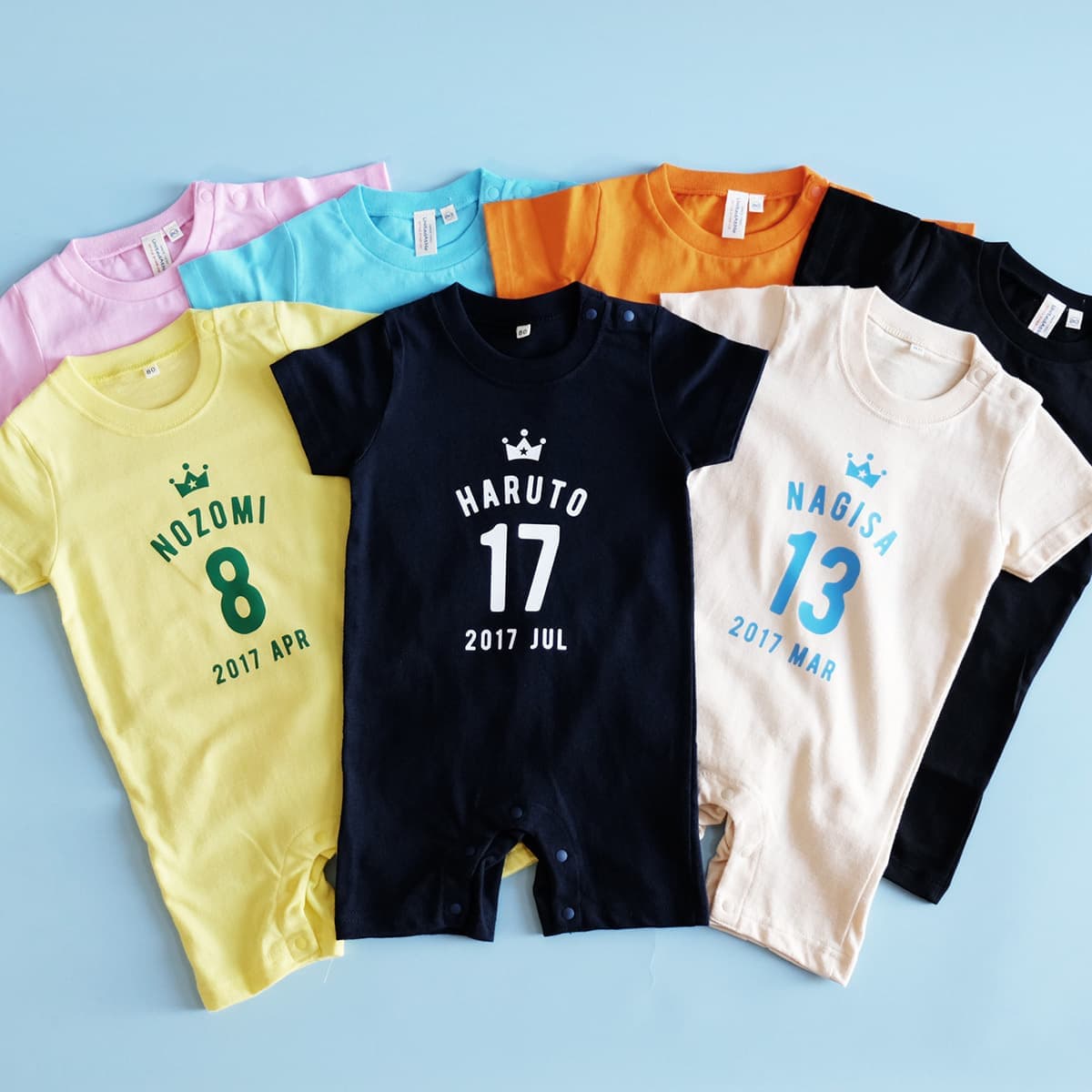 ベビーロンパースは全8色。ポスターもデザインや素材をお選びいただけます。ベビーポスター、ロンパースは単品でもご注文いただけます。